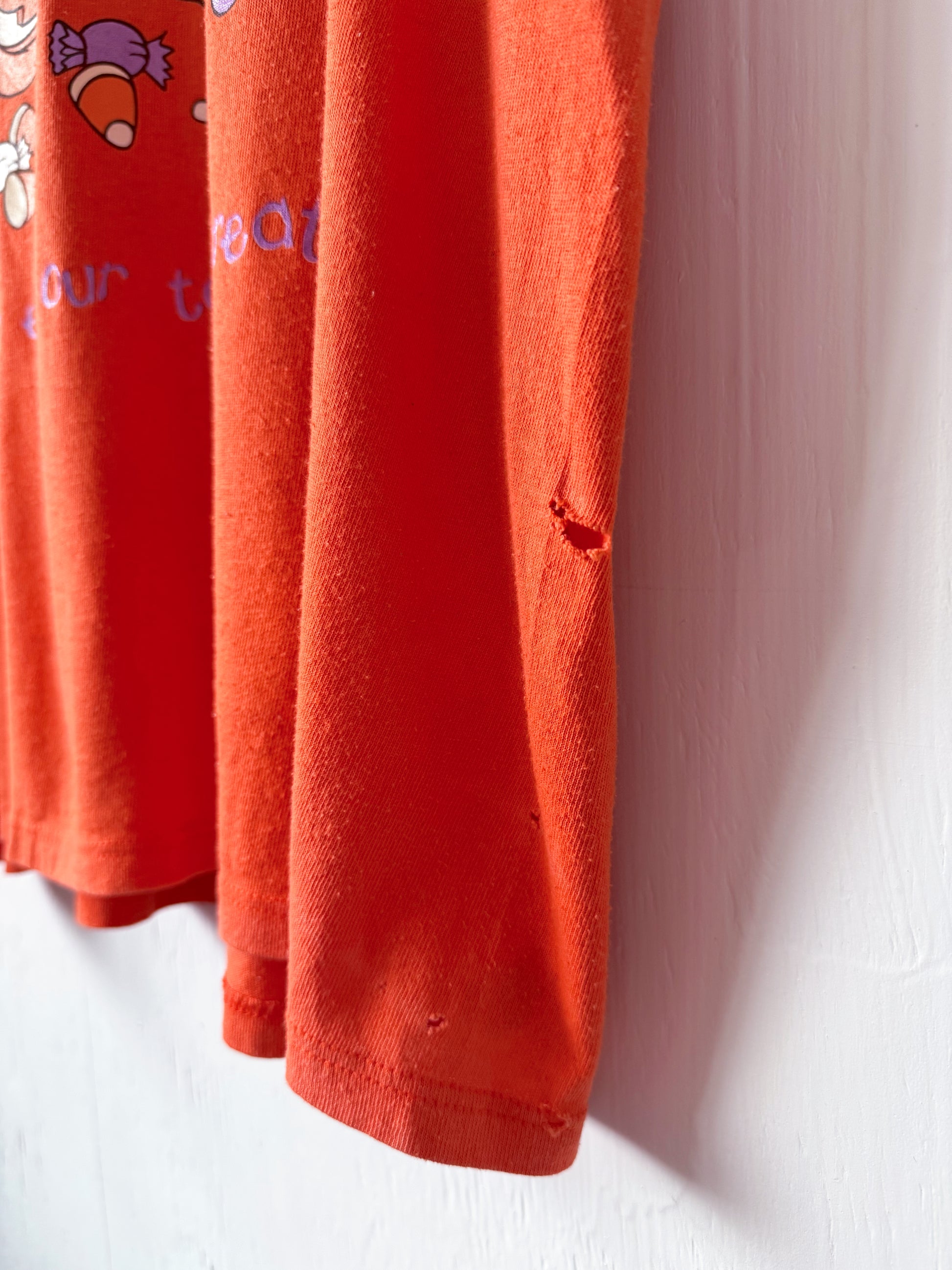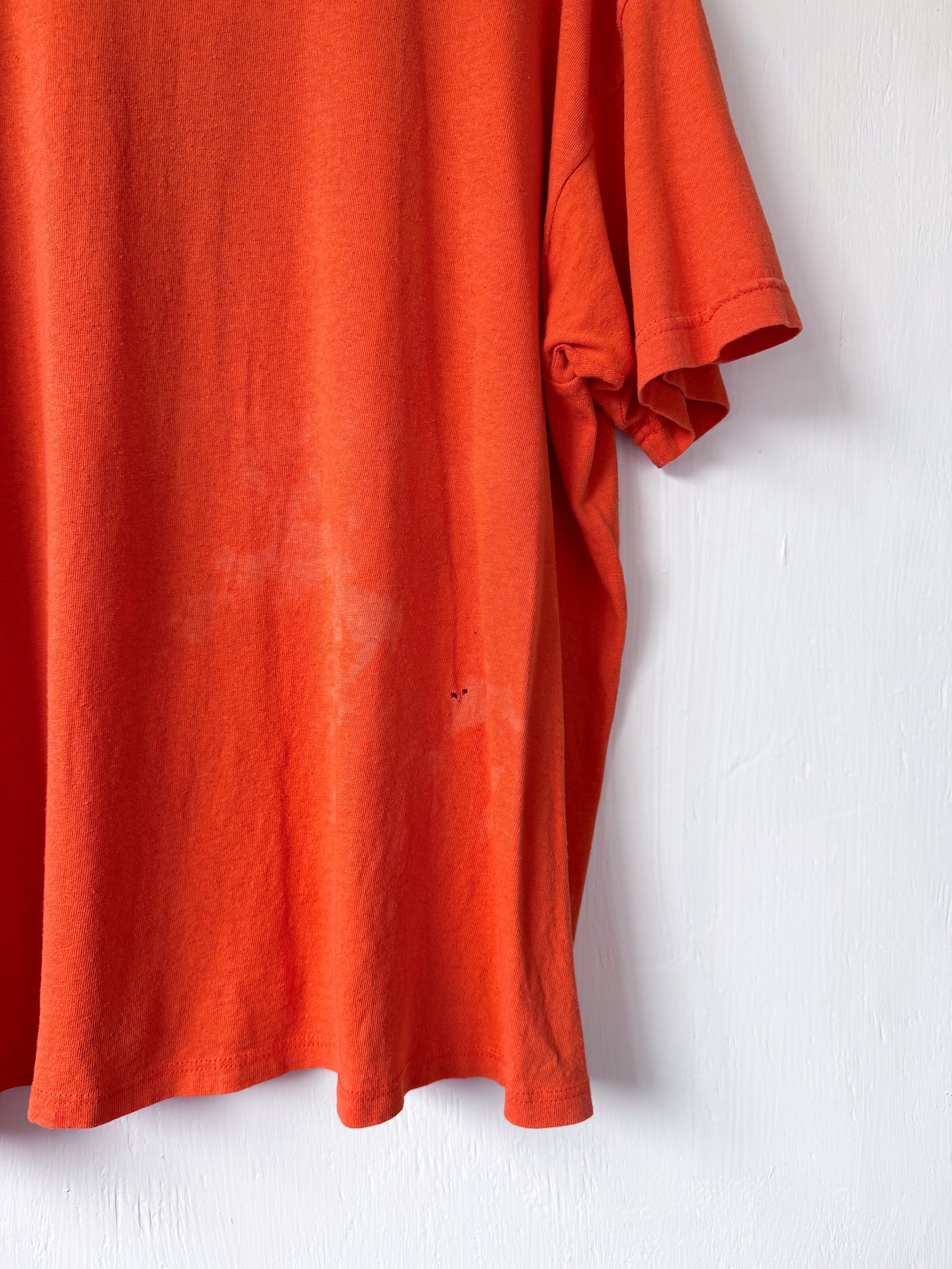 Shirt has multiple small holes (pictured) and very light bleach-like discoloration in a few areas (pictured). Size tag is out. Measures as an XL/2X.